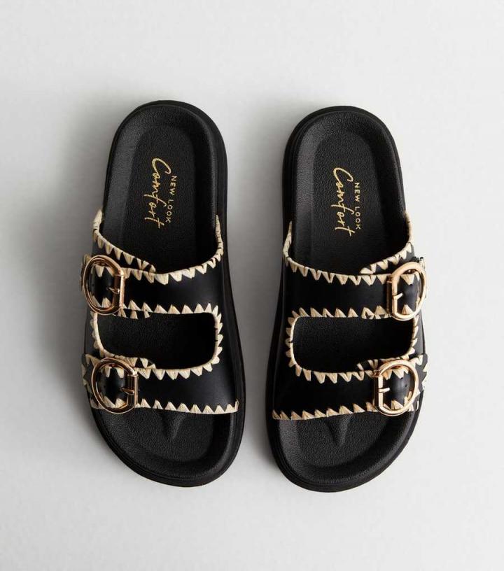 Sandals | New Look Womens Wide Fit Black Leather-Look 2 Part Footbed Sandals