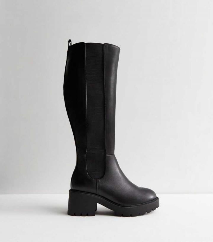 Shoes & Boots | New Look Womens Wide Fit Black Leather-Look Chunky Knee High Boots