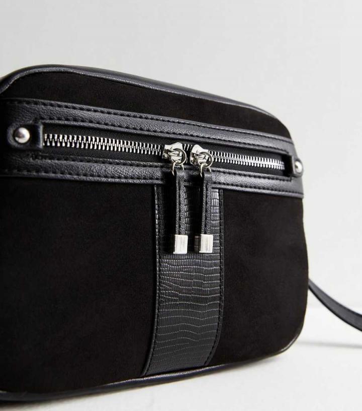– Suedette finish- Silver-tone hardware- Leather-look and faux croc details- Zip front pocket- Adjustable cross-body strap- Zip-top fastening