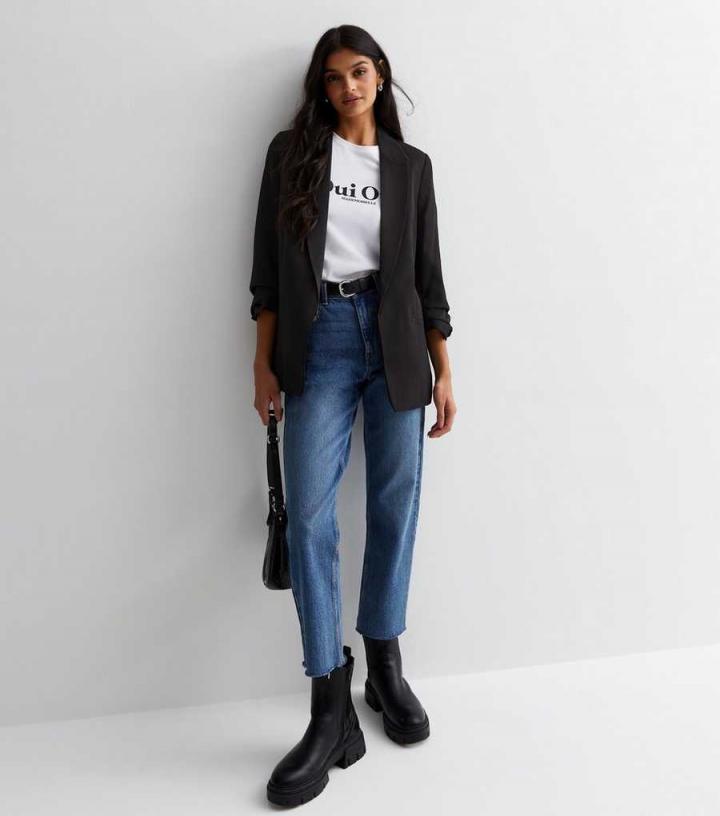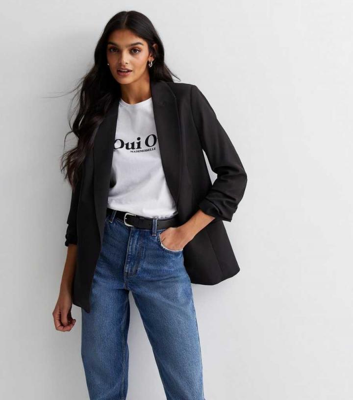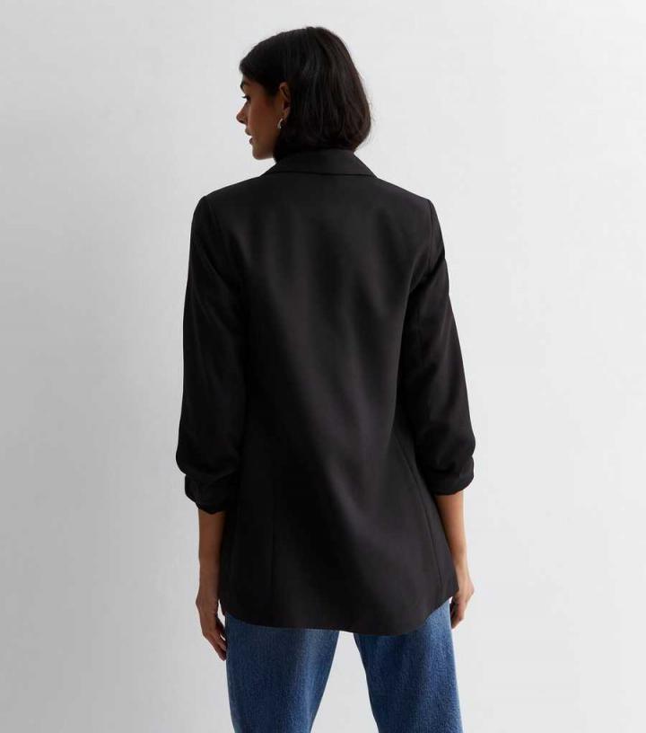 An office-to-out staple gets a cool twist with this black ruched sleeve blazer. Its classic colourway is perfect for all occasions, styling breezily with a graphic tee and trousers or a mini skirt and heels.- Revere collared neckline- 3/4 ruched sleeves- Side pocket detail- Lightweight woven fabric- Regular fit- Model is 5’8"/173cm and wears UK 10/EU 38/US 6