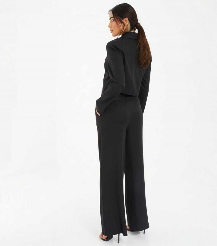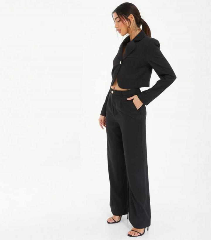 QUIZ. Styled for work or play, this black tailored crop blazer can be perfectly paired with the matching woven wide leg trousers for a stylish duo. – Black- Notched lapels- Single button fastening- Faux chest we…