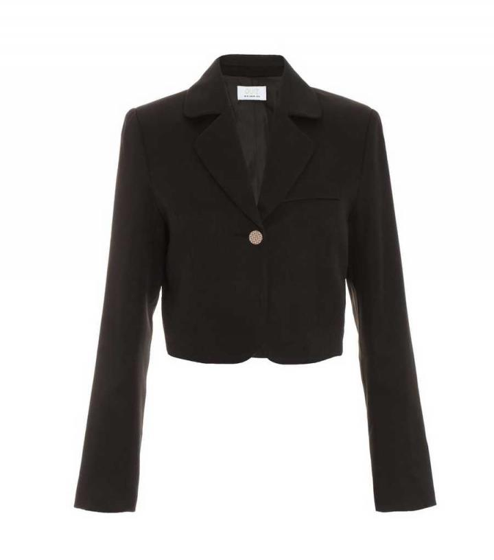 – Black- Notched lapels- Single button fastening- Faux chest welt pocket- Long sleeves- Curved hemline- Crop length