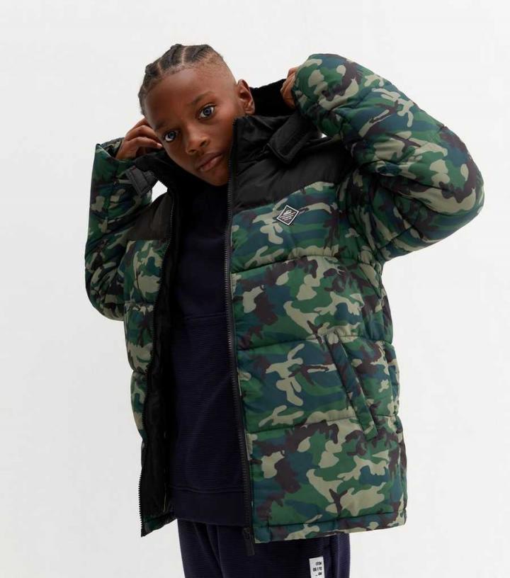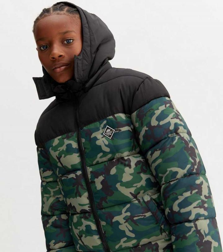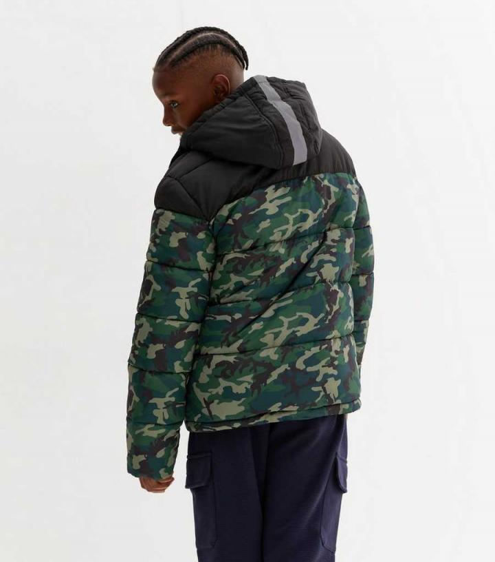 Boys Green Camo Colour Block Hooded Puffer Jacket New Look…