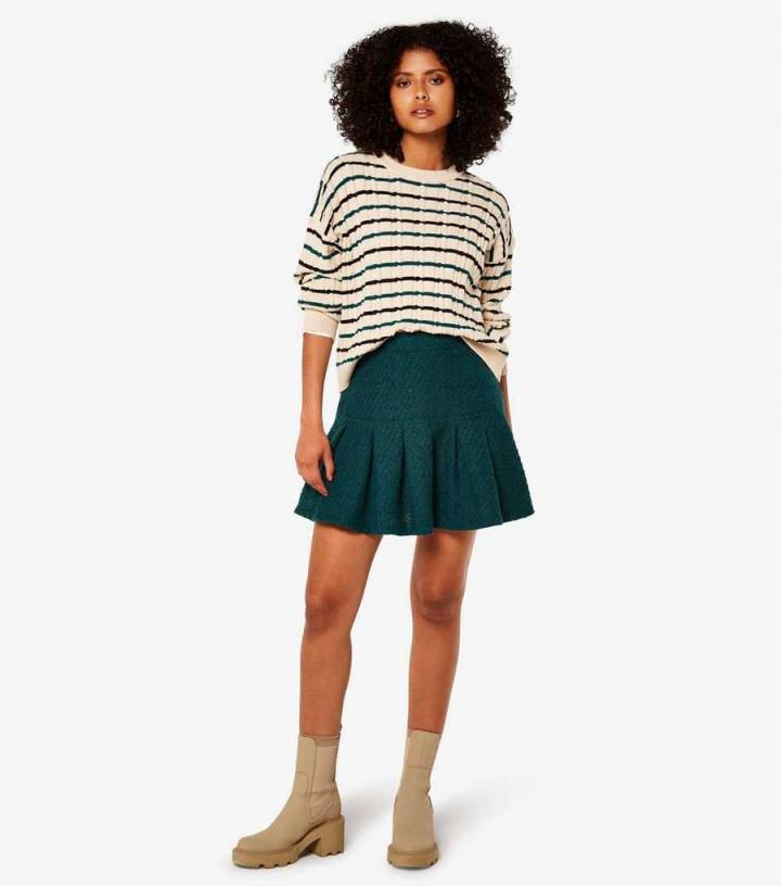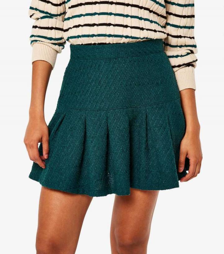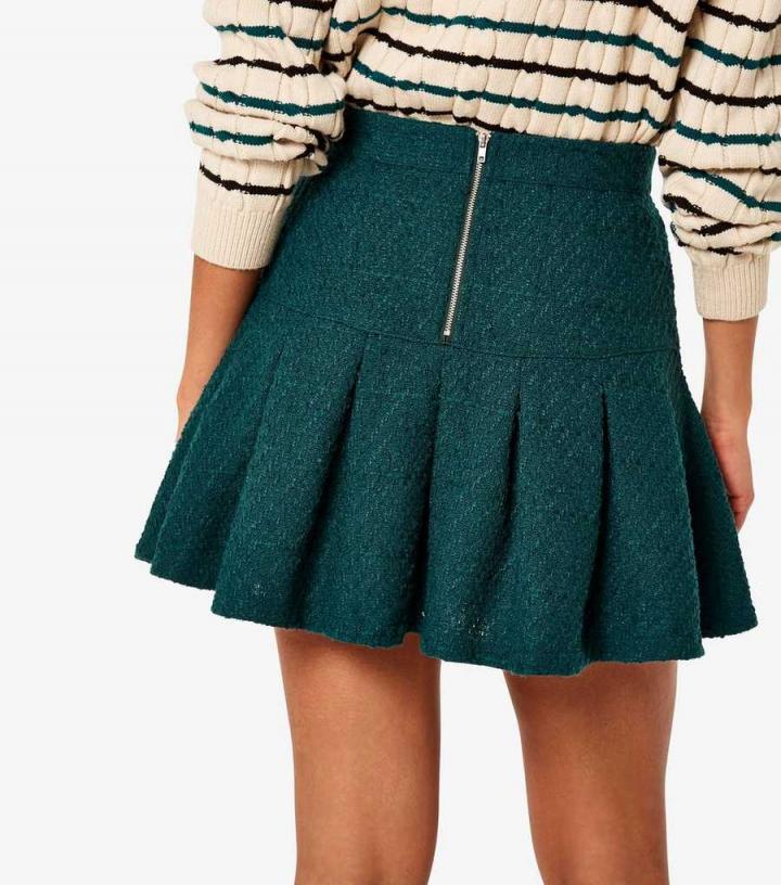 Apricot. Classic in shape, this green mini skirt boasts a box pleated hem and tweed finish. Carrying you through this season and next, wear with tights now, then bare legs once spring comes around.