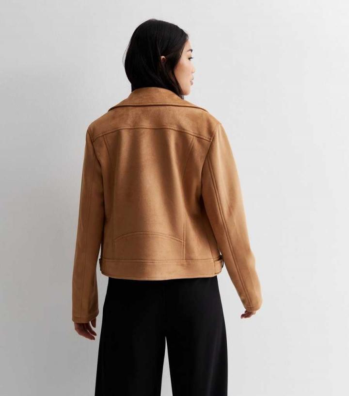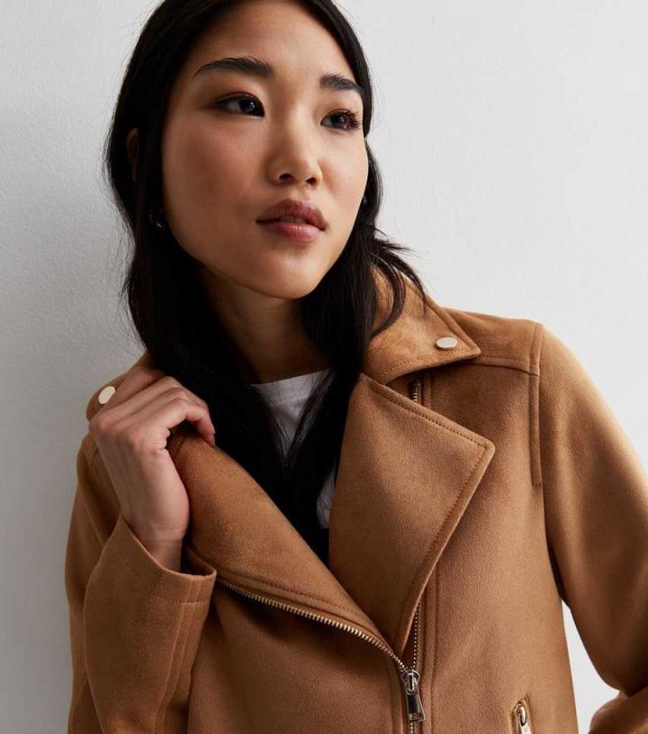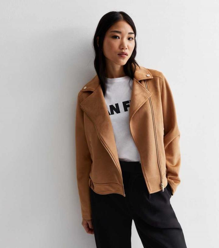Made from a soft suedette fabric, this tan biker jacket is a transitional staple. Layer over everything from knits to midi dresses for effortless style.