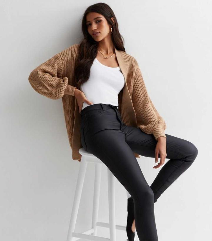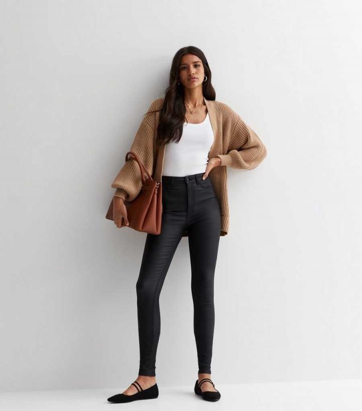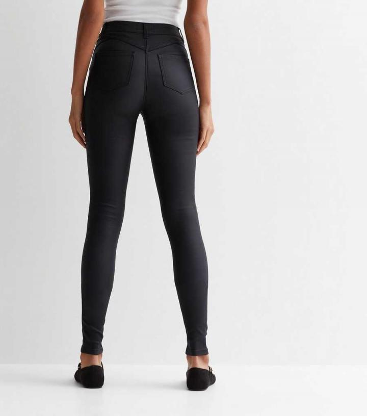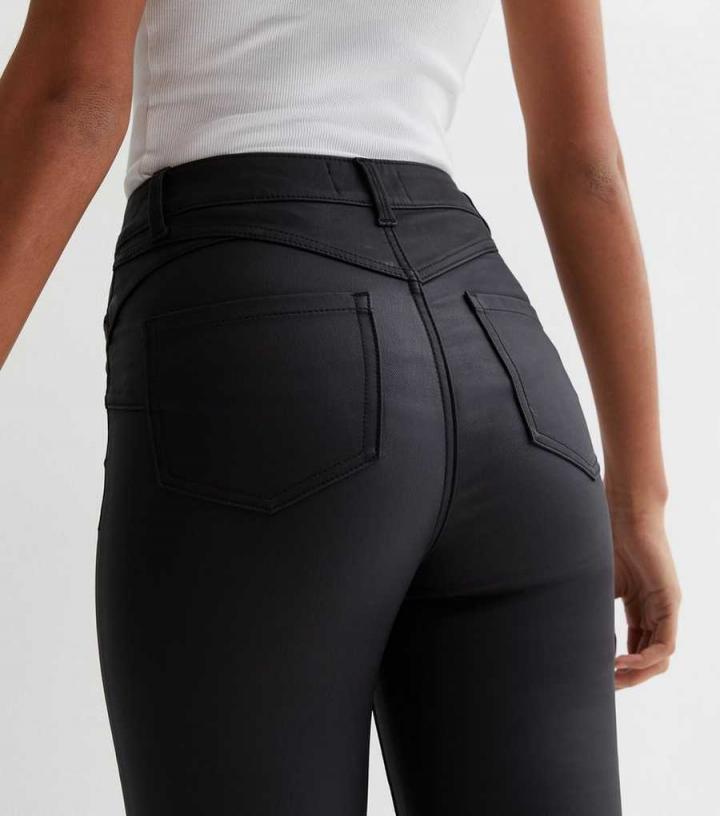 – Black- High-stretch- Coated leather-look fabric- Skinny fit- Sits above the waist- Full length- Button and zip fly fastening- Belt loops- 5-pocket design- Sculpting seams- Model is 5’10.5"/179.5cm and wears UK 10/EU 38/US 6