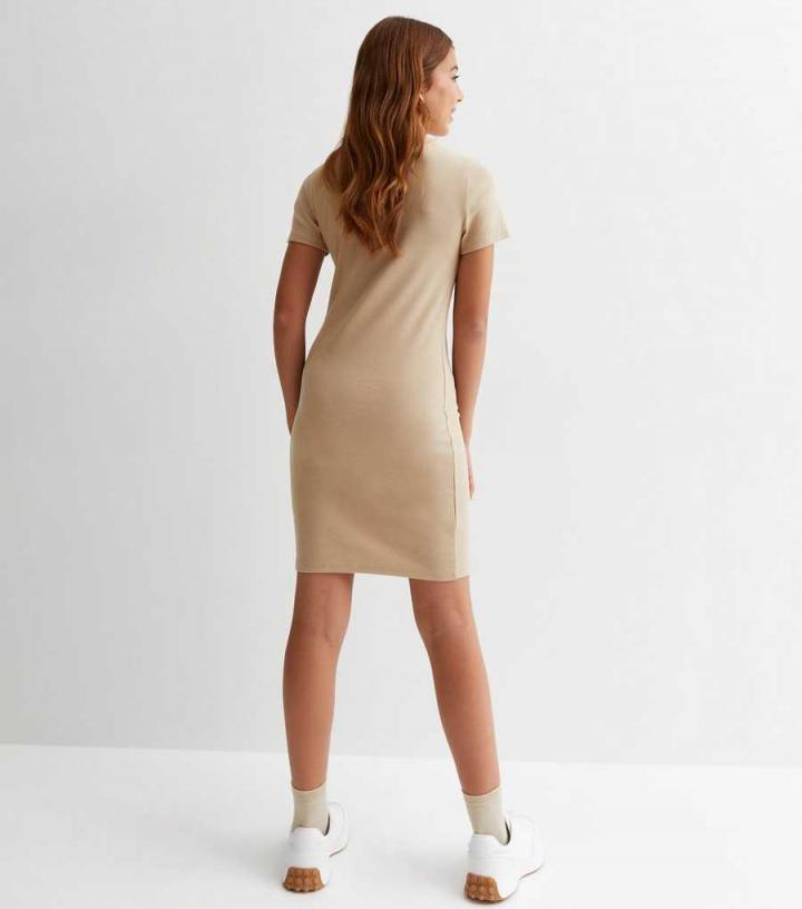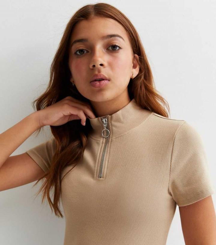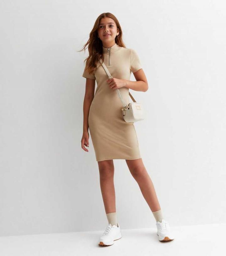 Girls. Featuring a high zip neck and short sleeves, this camel mini dress is a cute and comfy piece to wear this spring/summer. Crafted from a soft ribbed fabric, this style can be worn with chunky flatforms and oversized sunnies or trainers and a baseball cap.