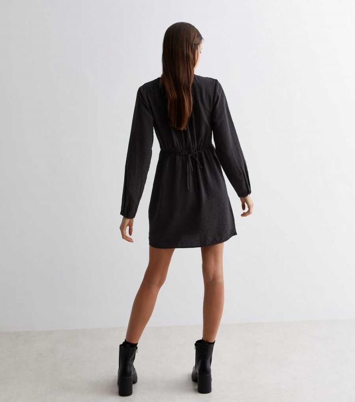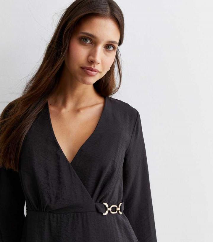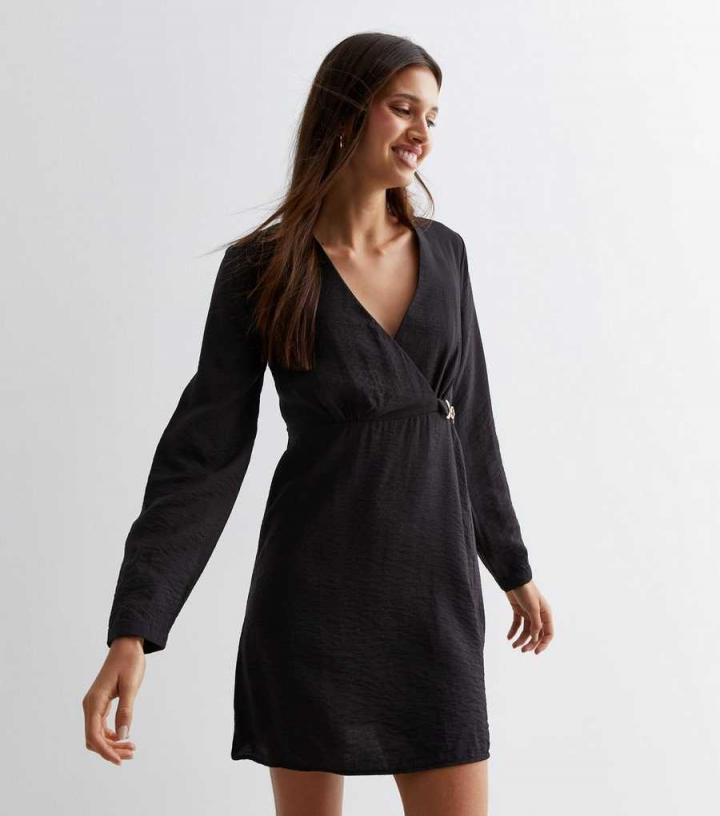 – Online exclusive- Black- V neckline- Long sleeves- Button cuffs- Wrap front- Buckle detail- Mini length- Lightweight woven fabric- A-line fit- Model is 5’8"/173cm and wears UK 10/EU 38/US 6