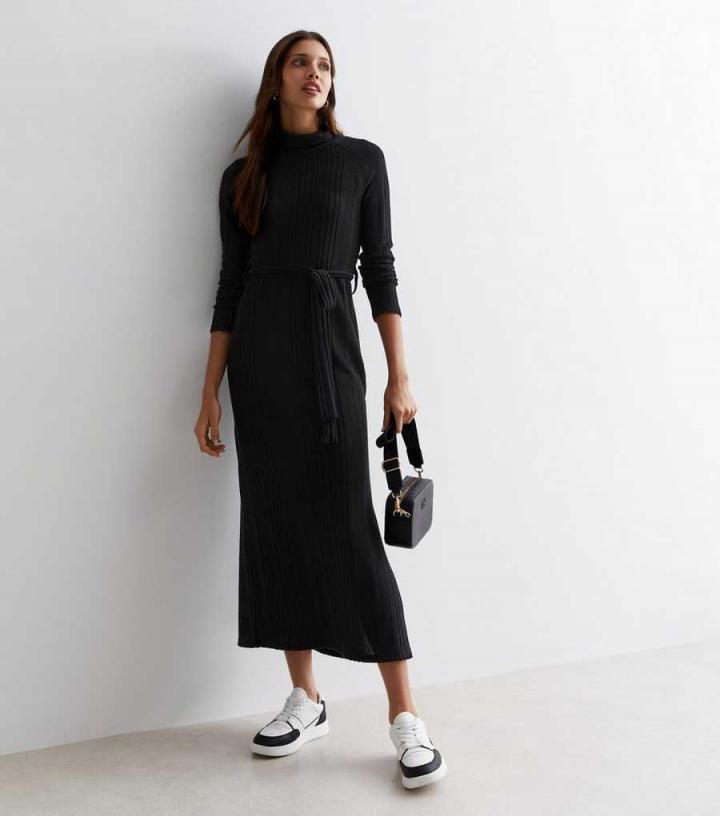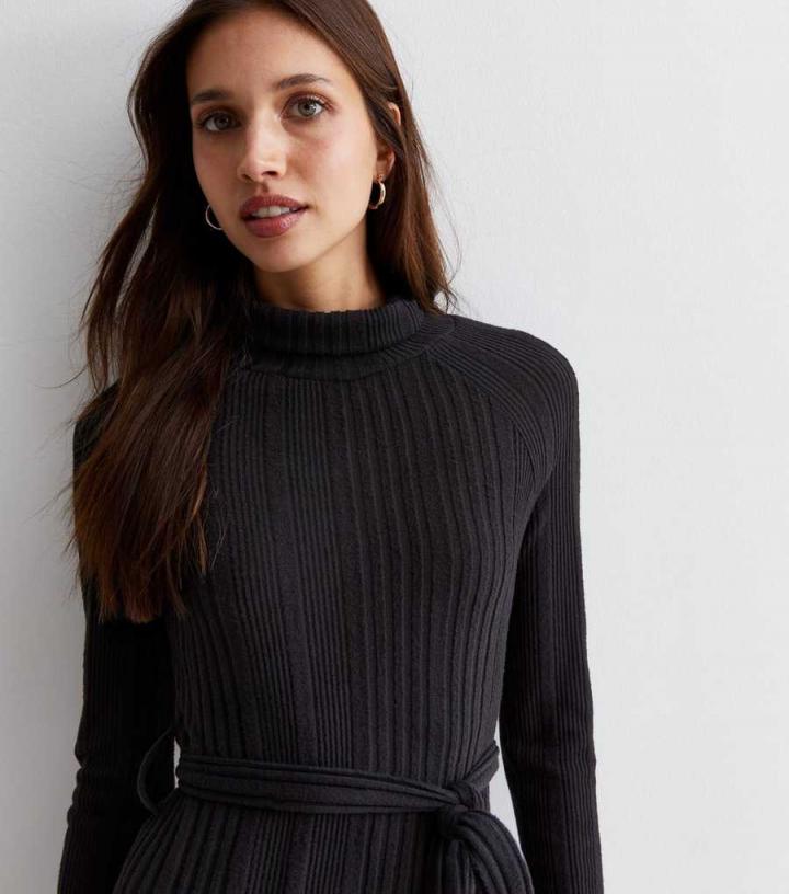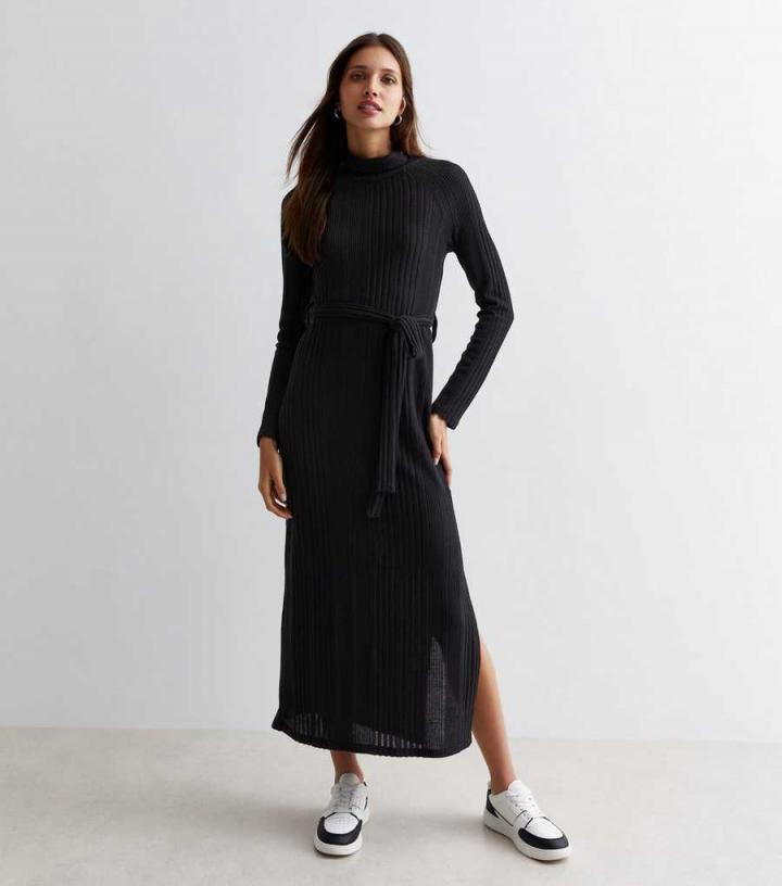 – Roll neckline- Long sleeves- Belted waist- Split hem- Midi length- Soft ribbed fabric- A-line fit- Model is 5’8"/173cm and wears UK 10/EU 38/US 6