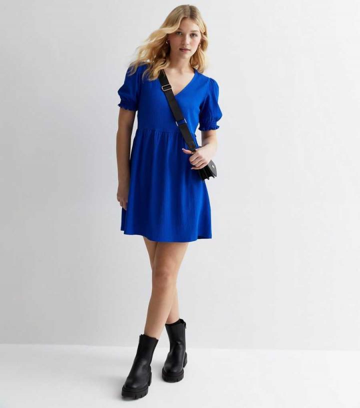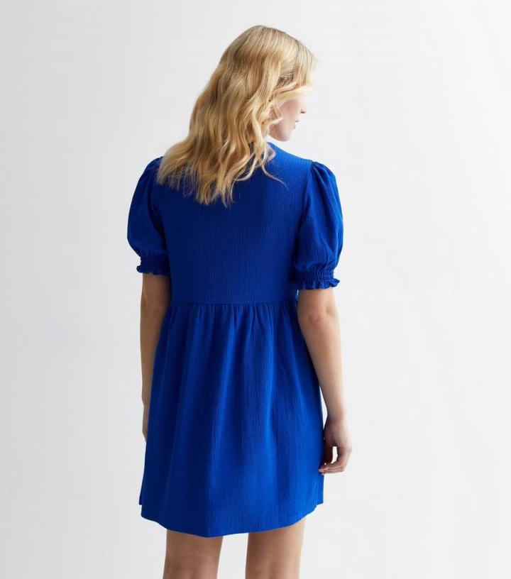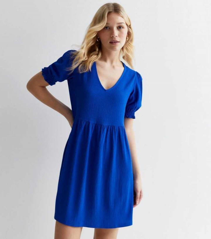 Crinkle jersey fabric and puff sleeves take this blue mini dress from simple to stylish. Perfect all-year round, we love it worn with ankle boots now and flat sandals when the temps warm.
