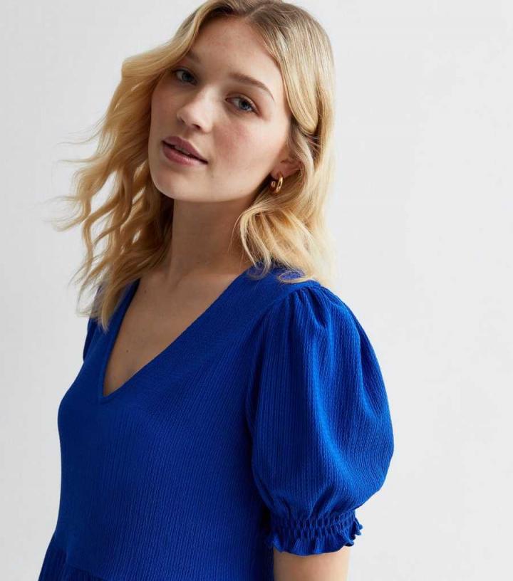 – Online exclusive- Blue- V neckline- Short puff sleeves- Mini length- Crinkle jersey fabric- Oversized fit- Model is 5’9"/175cm and wears UK 10/EU 38/US 6