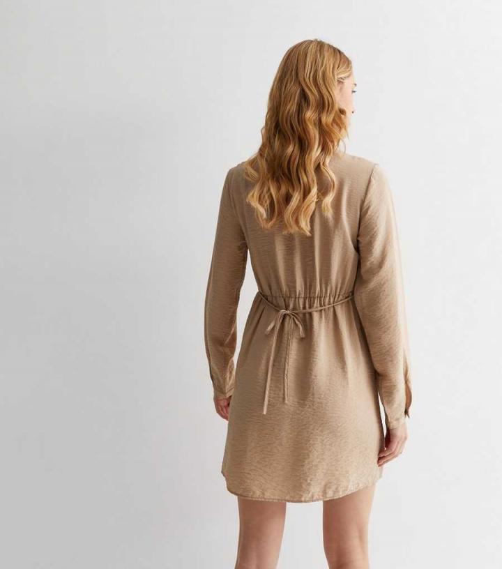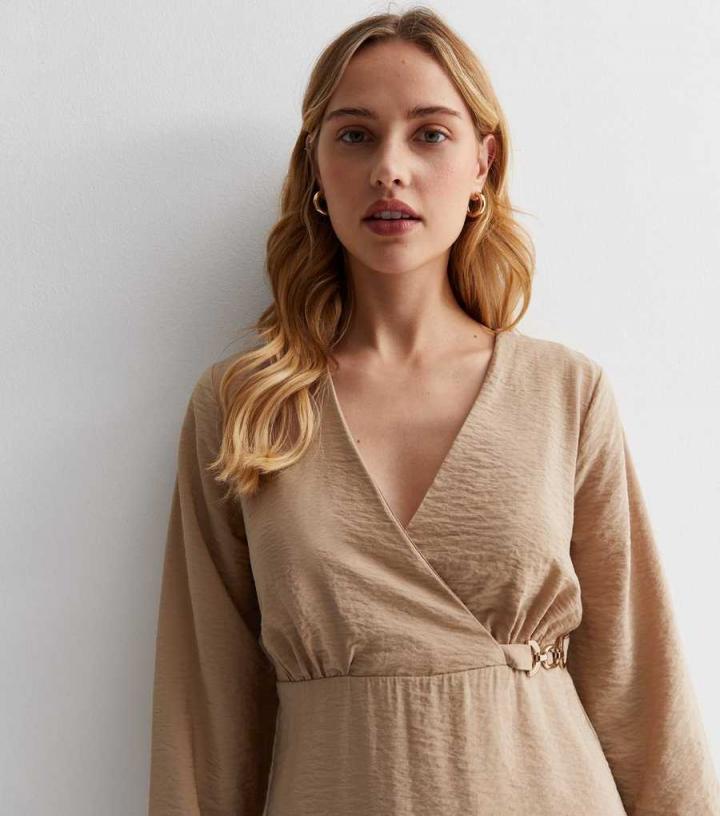 – Camel- Crinkled finish- Wrap silhouette- V-neck- Long sleeves- Button cuffs- Decorative side buckle detail- Elasticated rear waist panel – Rear tie fastening- A-line hem- Model is 5’8"/173cm and wears UK 10/EU 38/US 6