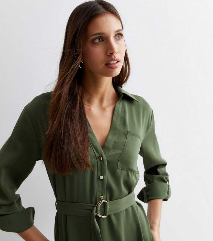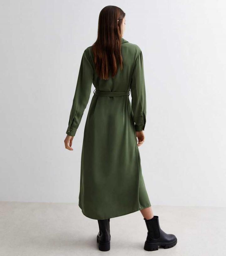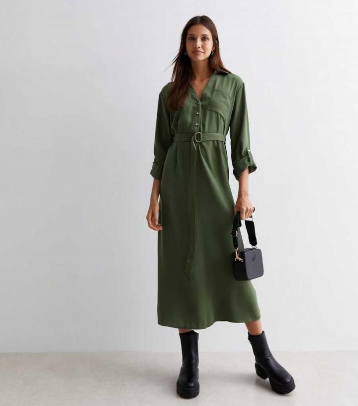 – Online exclusive- Khaki- V neckline- Long roll sleeves- Chest pocket- Belted waist- Button front- Midi length- Lightweight woven fabric- A-line fit- Model is 5’8"/173cm and wears UK 10/EU 38/US 6