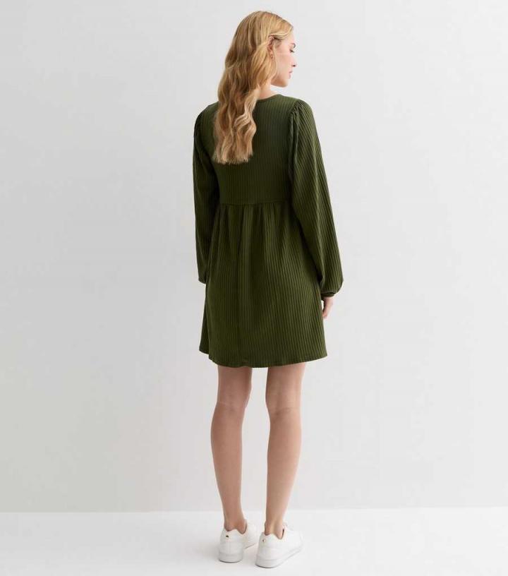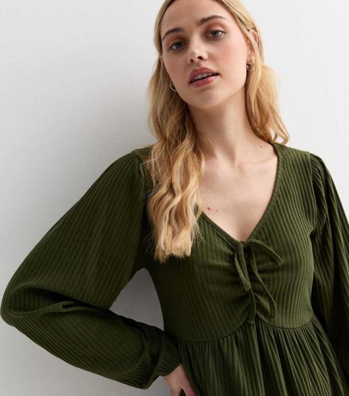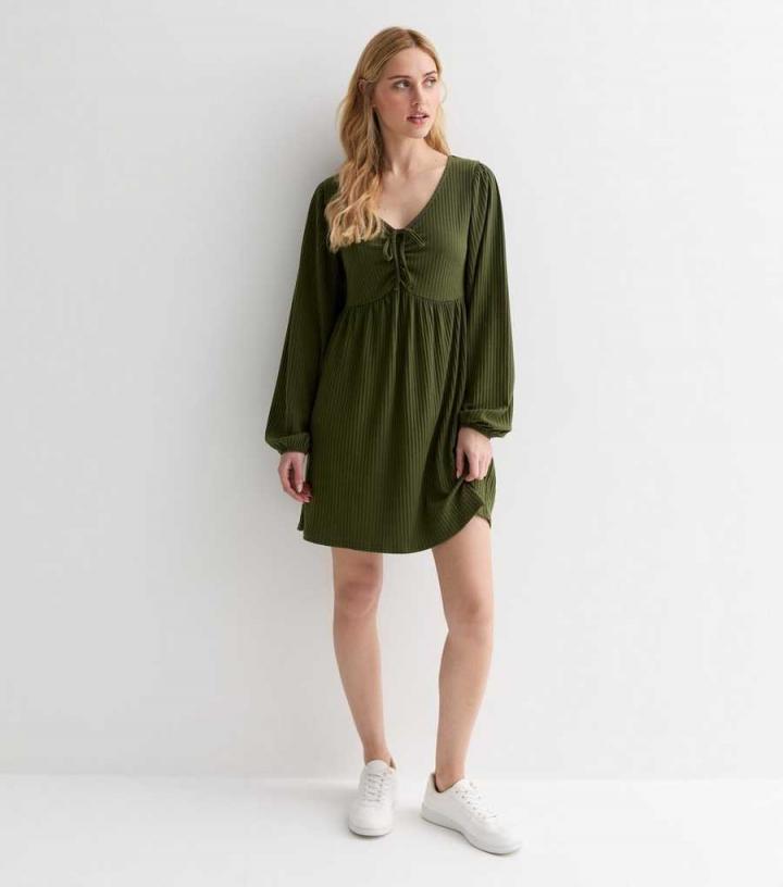 – Online exclusive- Olive green- V neckline- Long cuffed sleeves- Tie ruched front- Mini length- Soft ribbed fabric- Regular fit- Model is 5’7"/171cm and wears UK 10/EU 38/US 6