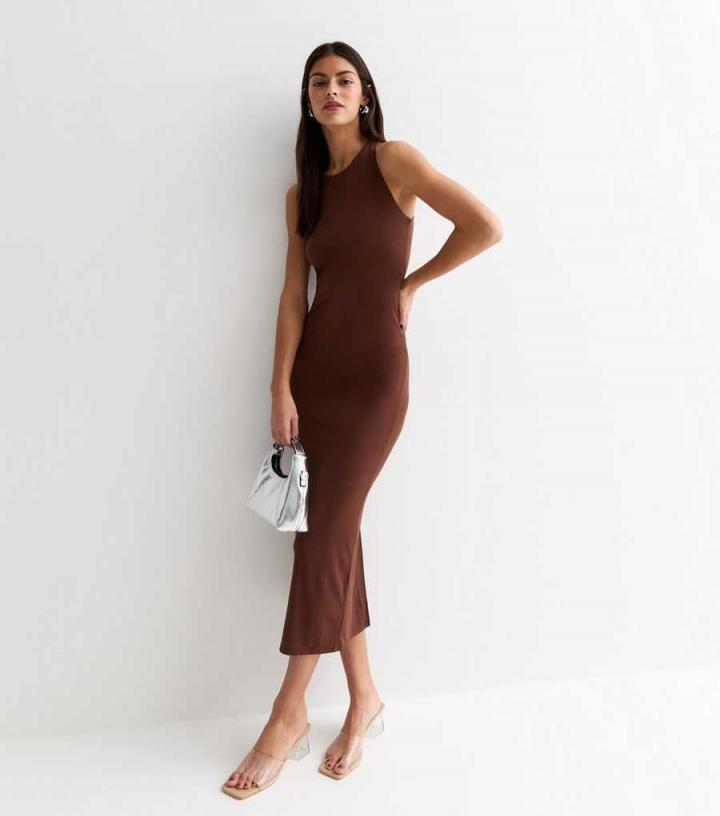– Rust- Rounded neckline- Sleeveless- Cross back- Rear split hem- Midi length- Jersey fabric- Slim fit- Model is 5’9"/175cm and wears UK 10/EU 38/US 6