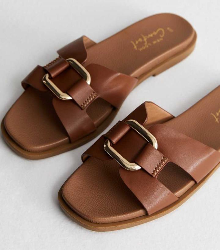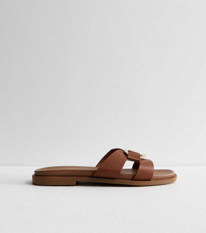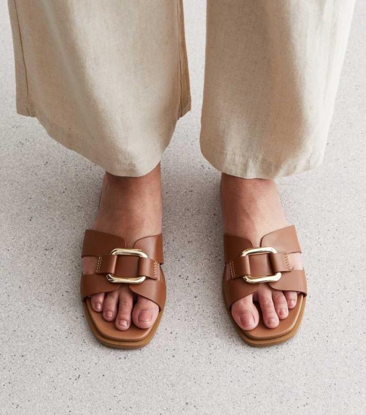 Get ready for those sun-seeking days ahead with these tan sliders, designed with a chic leather-look finish.