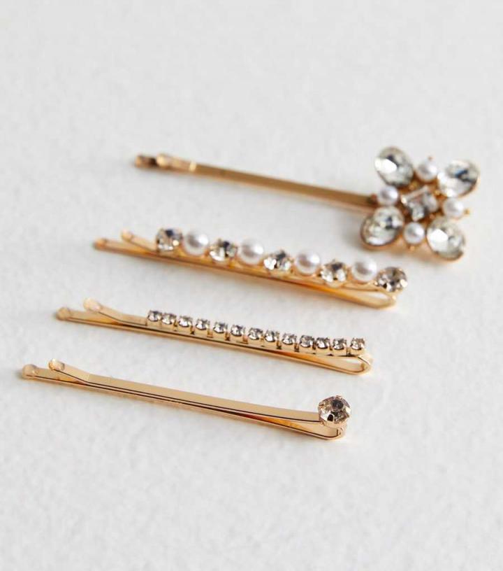 – Gold tone – Faux pearl detail- Varying sized diamantés- Assorted designs- Hair slide fastening- 4 pack