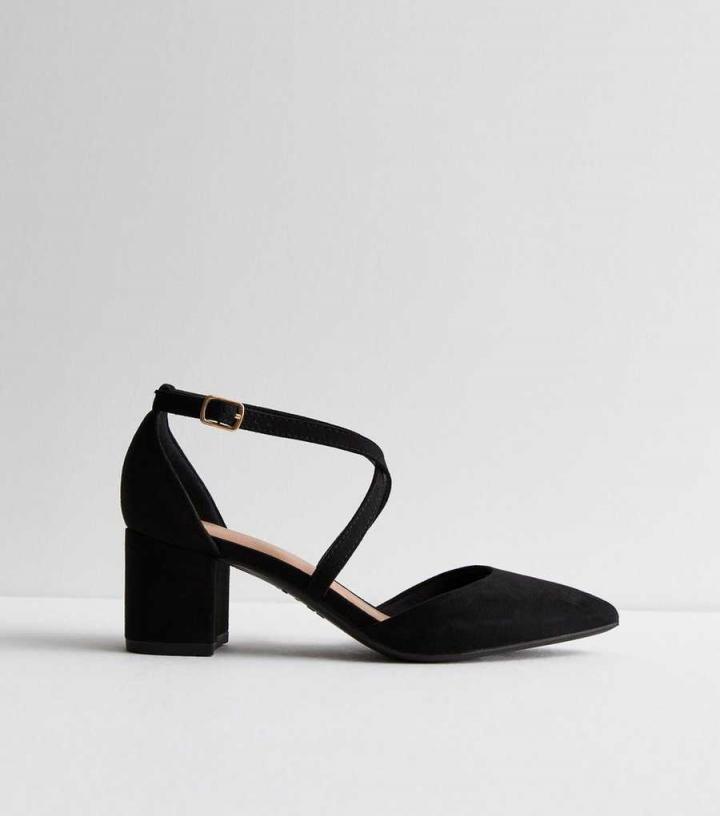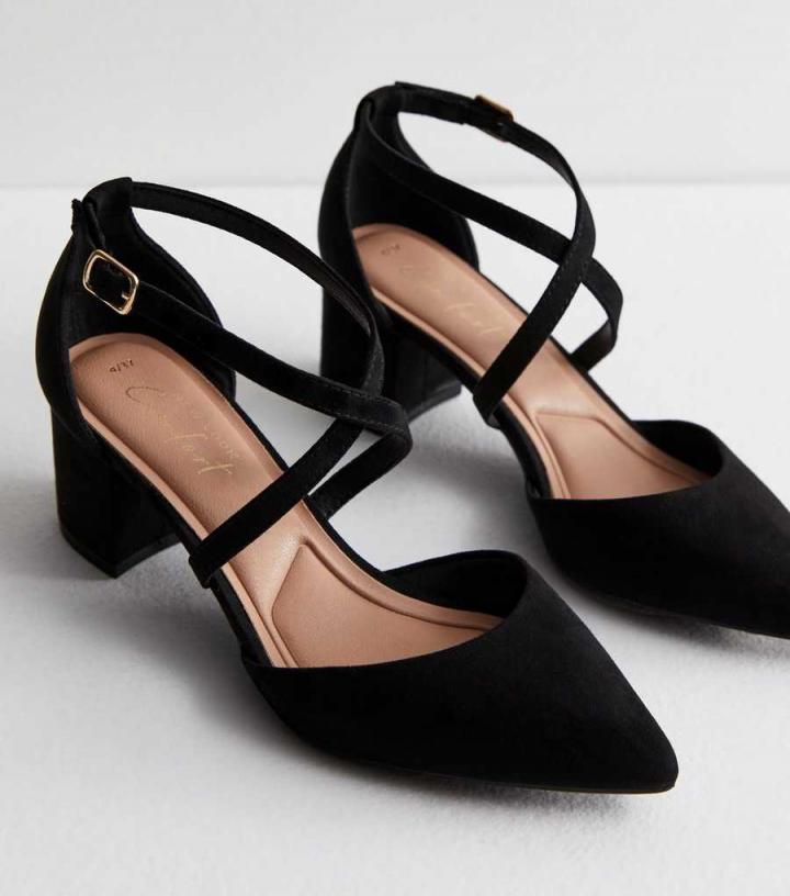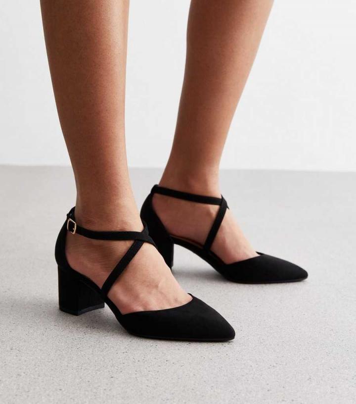 – Comfort lining- Cushioned heel- Cushioned underfoot padding- Flexible soles- Soft suedette fabric- 2-part design- Pointed toe- Gold-tone buckle- Cross ankle-strap fastening- Mid block heel