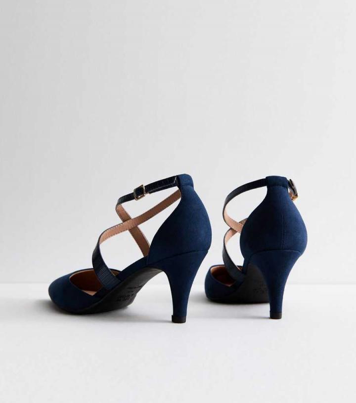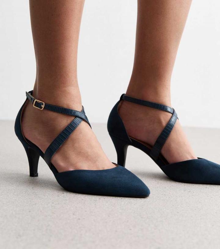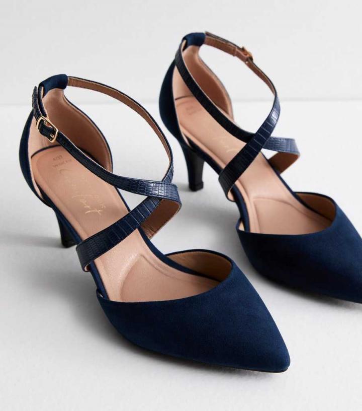 – Wide fit- Extra measure across the insole, joint and instep- Comfort lining- Cushioned heel- Cushioned underfoot padding- Flexible soles- Navy- Suedette finish- Pointed toe- Leather-look cross-over straps- Ankle strap fastening- Flat sole- Stiletto heel- Heel height: 2" / 5.8cm