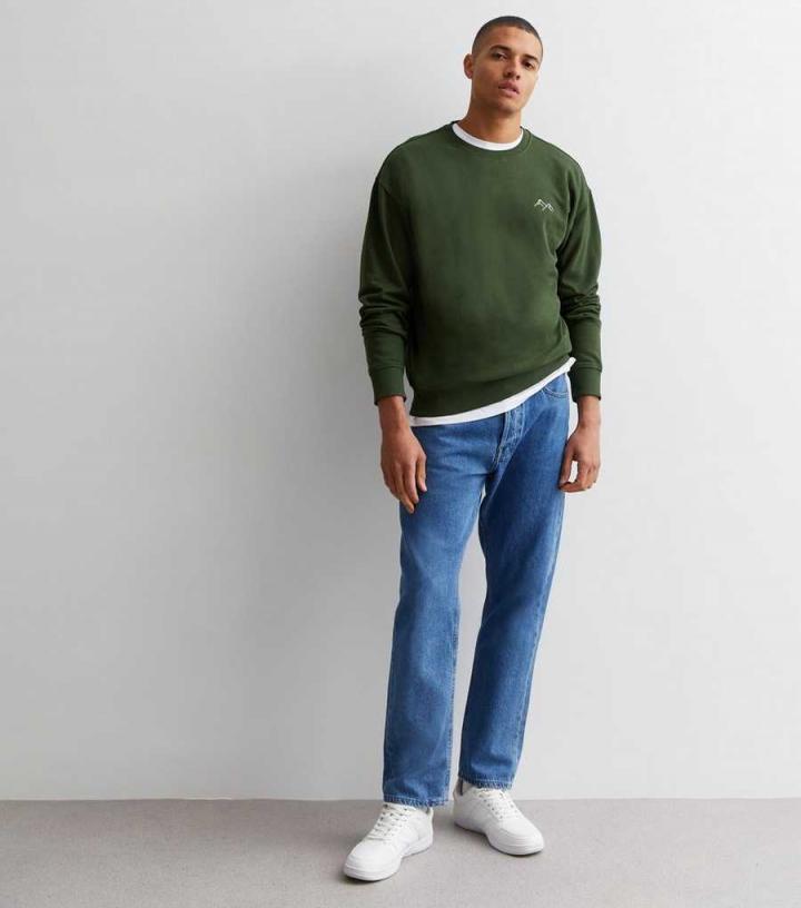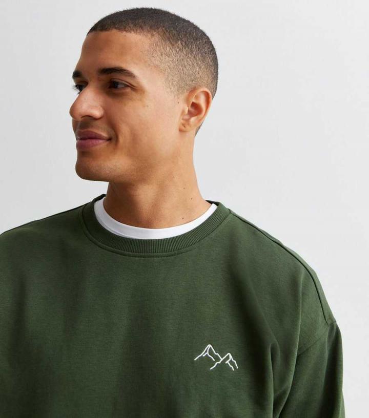 Mens Khaki Mountain Embroidered Crew Neck Relaxed Fit Sweatshirt New Look…