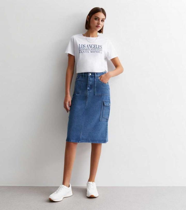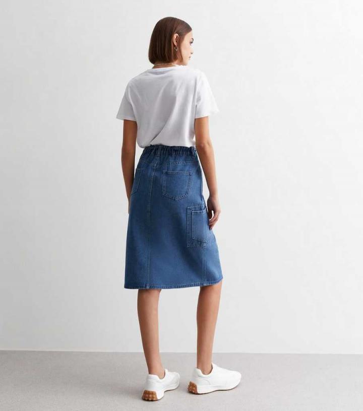 Blue Vanilla. Cut to a versatile midi length with trending cargo pockets, this blue denim skirt is equal parts practical and stylish. For a casual weekend vibe, pair with a logo T-shirt and trainers or add a trench coat to beat the chill.