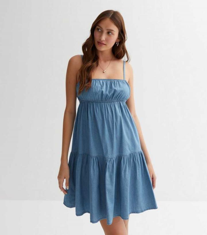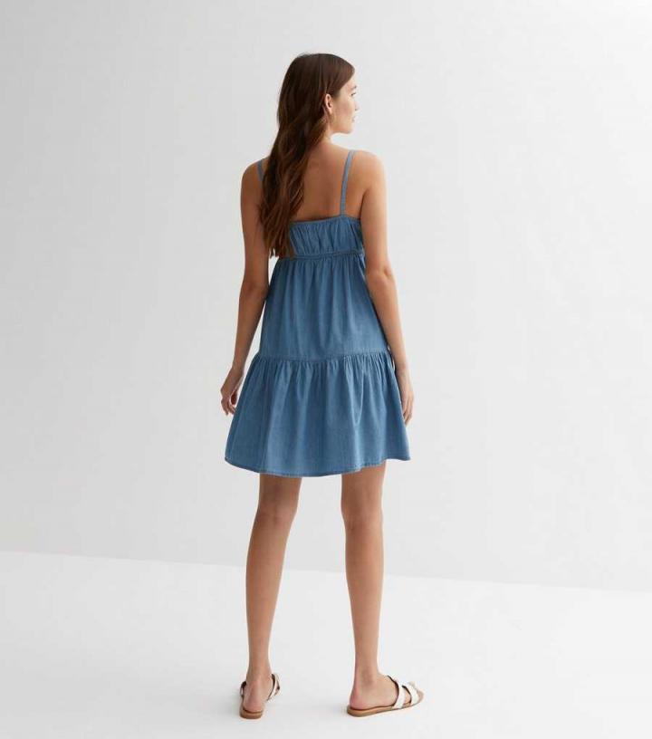 – Square neckline- Shoestring straps- Tiered hem- Mini length- Mid-wash denim- Fit-and-flare design- Model is 5’8"/173cm and wears UK 10/EU 38/US 6