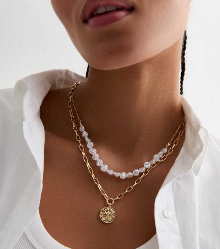 – Gold-tone finish- Layered- Irregular faux pearl details- Beaten disc- Chain design- Lobster-clasp fastening