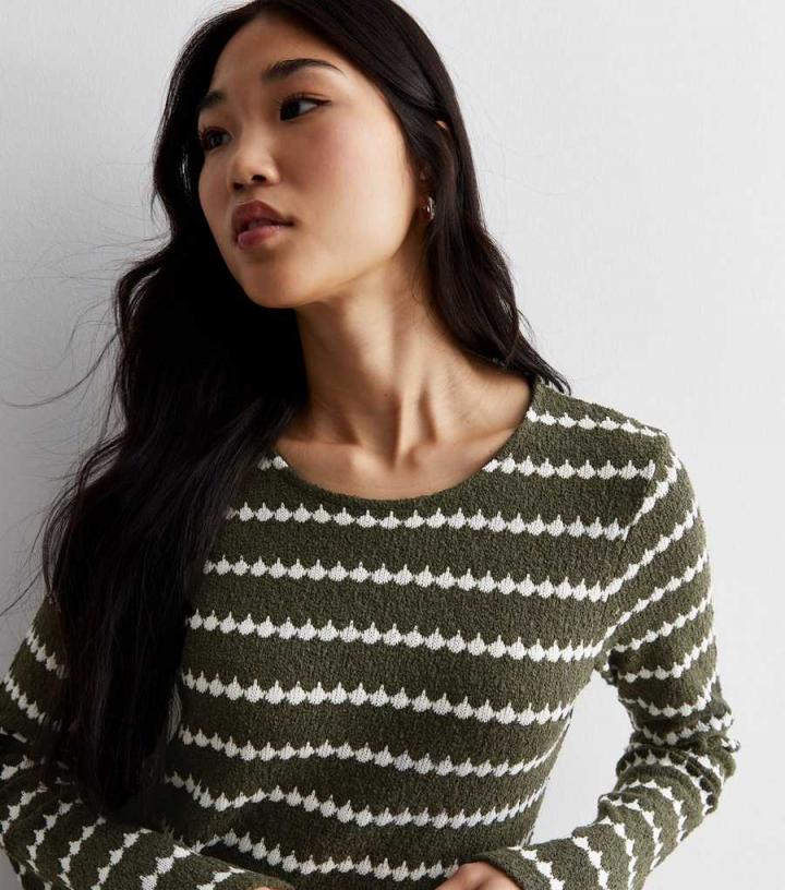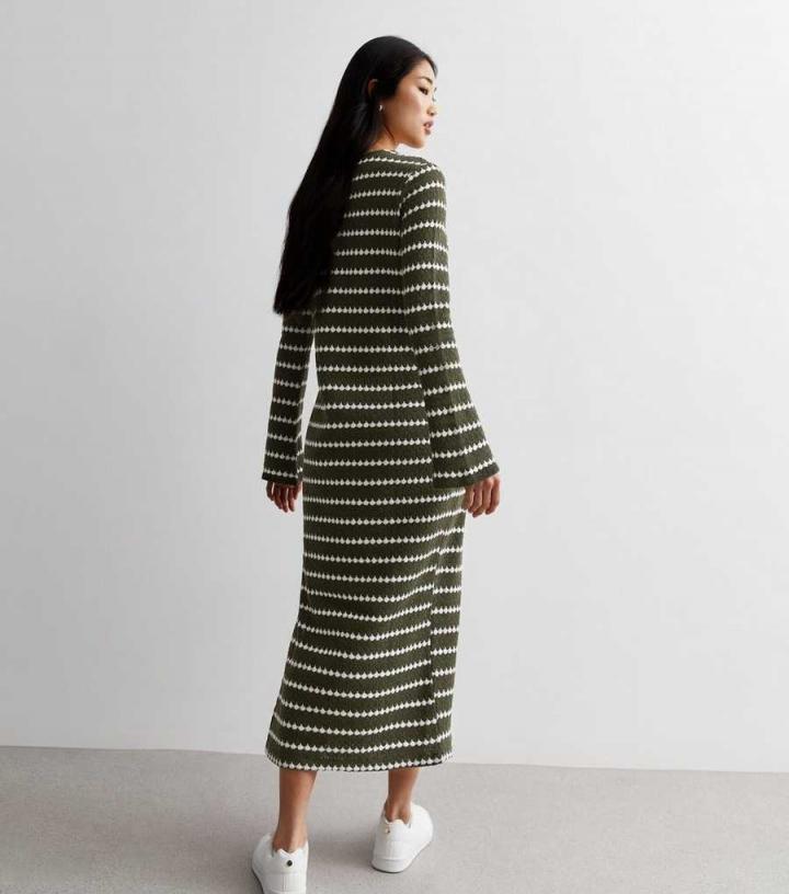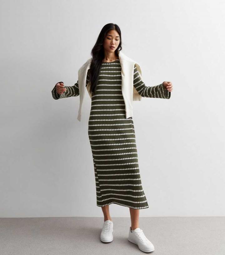 – Khaki green/white- Knit finish- Stripe pattern- Round neck- Flared long sleeves- Straight cut- Single side slit- Above ankle length – Model is 5’9"/175cm and wears size S