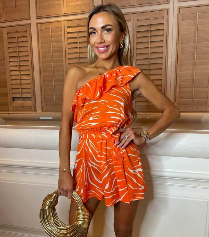– AX Paris- Bright orange/white- Two tone pattern- Frill trim- One shoulder – Elasticated waist- Wide shorts