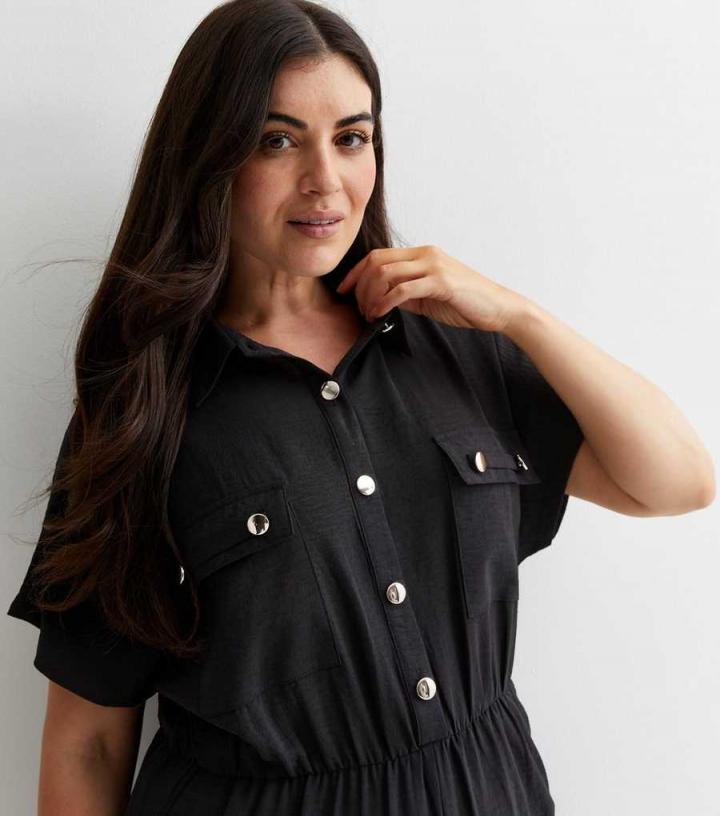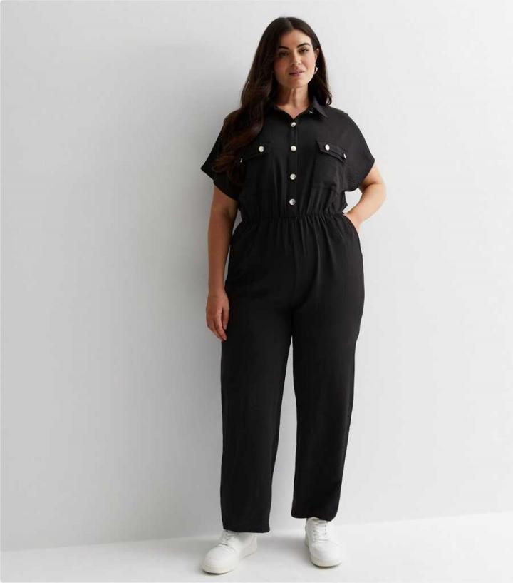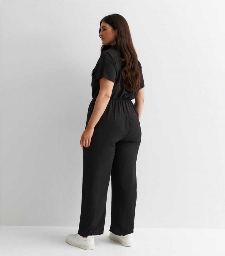 Curves. Refresh your edit and choose this black wide leg jumpsuit with pocket details and a collared neckline. Wear with ice-white trainers and a cross-body bag for cool and comfy vibes all day long.