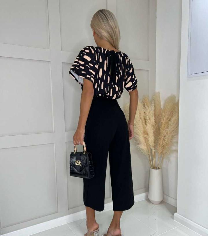 – Abstract print- Crew neckline- Short sleeves- Tie back- Wide leg- Cropped length- Soft woven fabric- Regular fit- Model is 5’8"/173cm and wears UK 10/EU 38/US 6