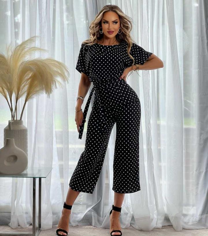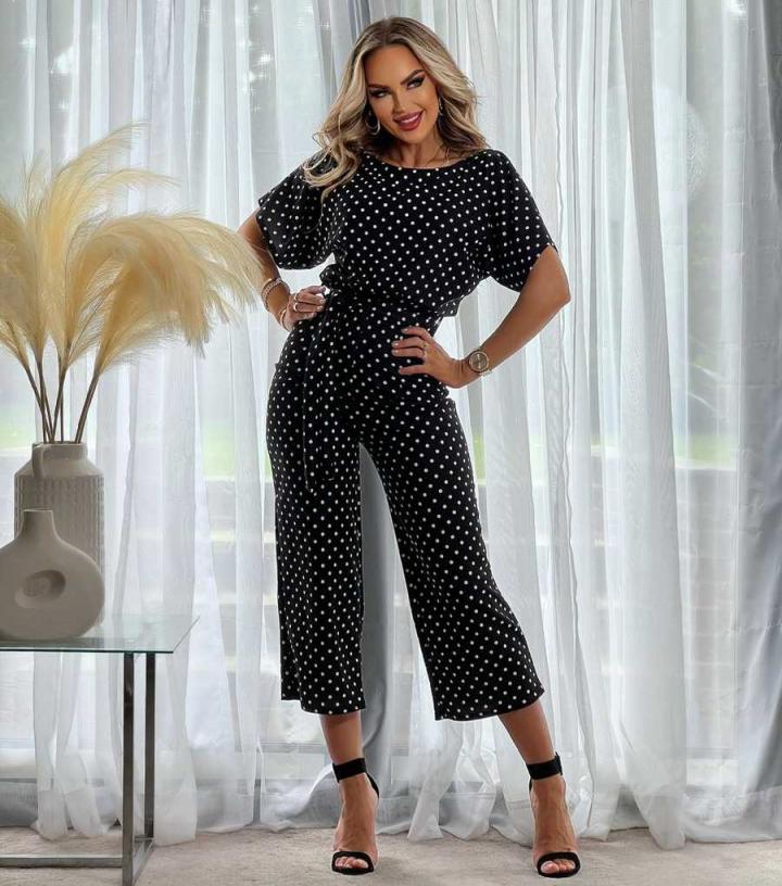 – Spot print- High neckline- Short flutter sleeves- Belted waist- Tie-back fastening- Cropped wide leg- Soft woven fabric- Regular fit – Model is 5’8"/173cm and wears UK 10/EU 38/US 6