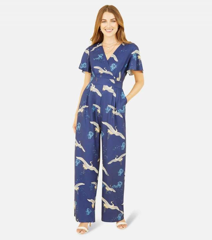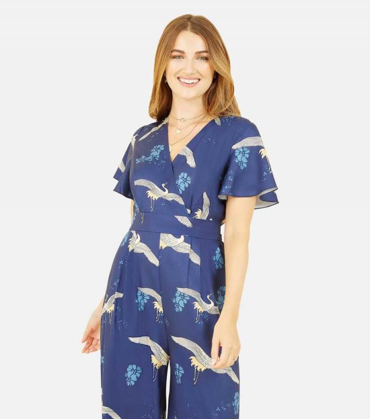 Yumi. Adorned with a crane print, shake up your wardrobe with this navy wrap jumpsuit.
