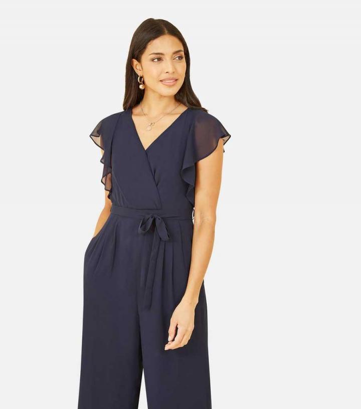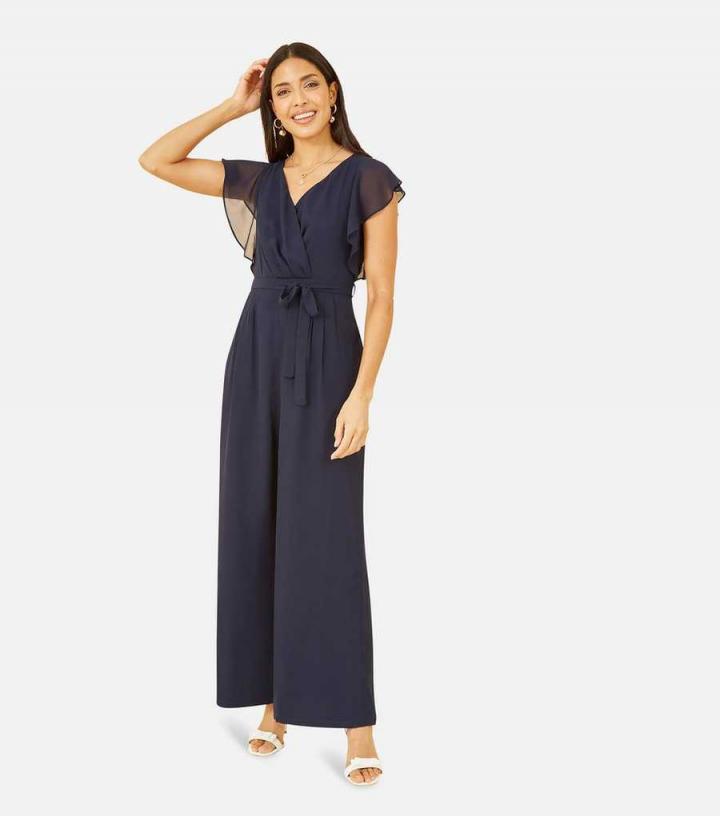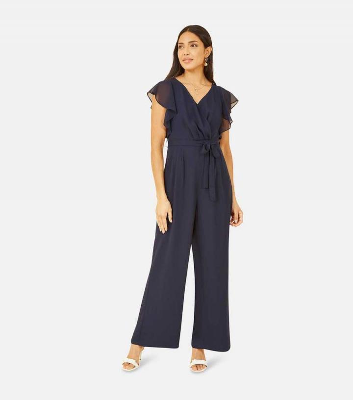 Yumi. Equal parts elegant and stylish, this navy jumpsuit boasts frill sleeves and a wide-leg design. A go-to for special occasions, complete the look with sky-high heels and a glossy lip.