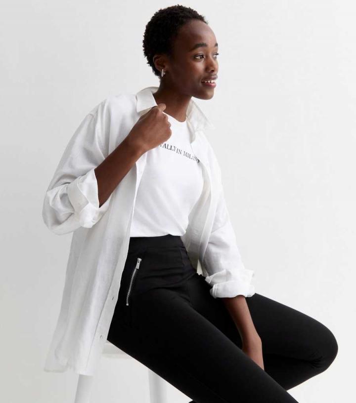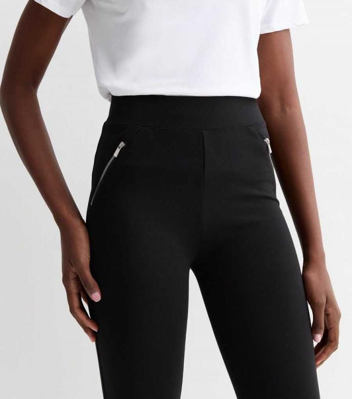 – Black- High waist- Zip detail- Soft woven fabric- Slim fit