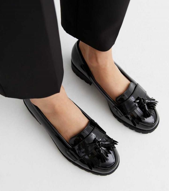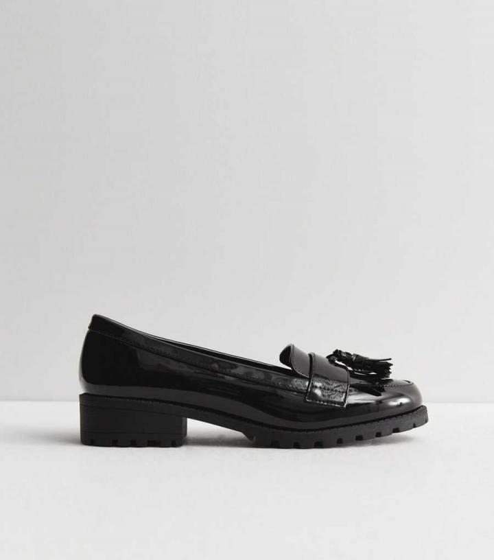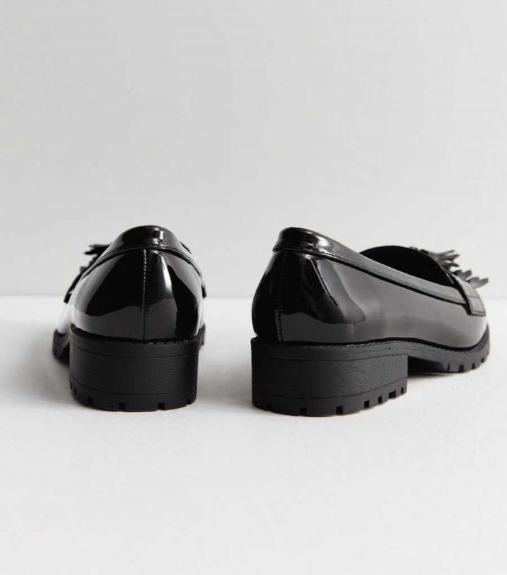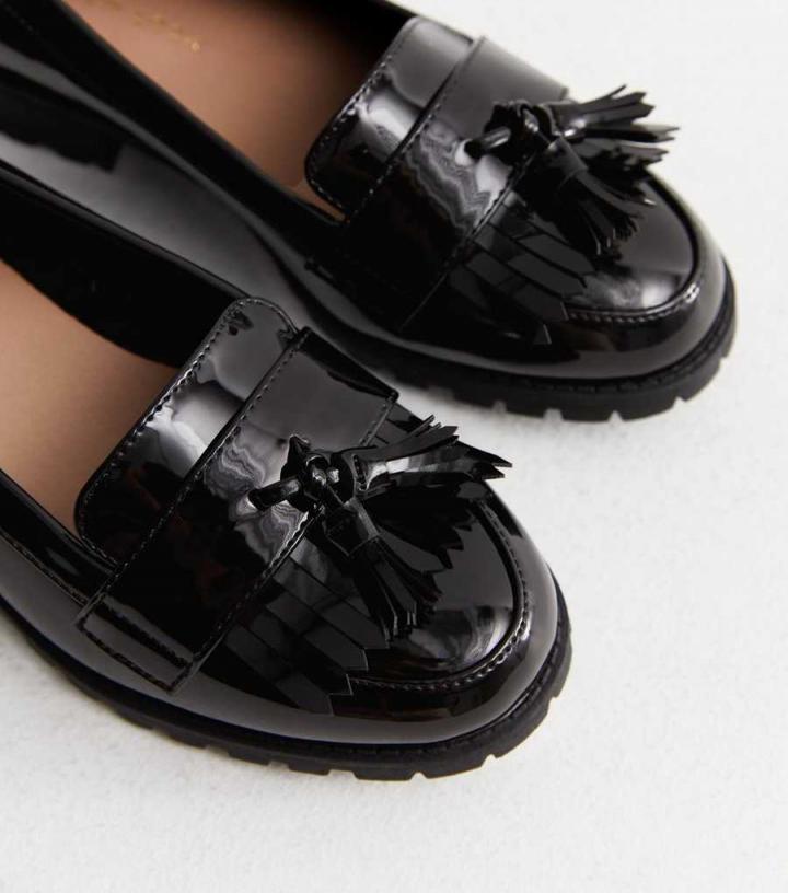 Loafers | New Look Womens Wide Fit Black Patent Chunky Fringe Loafers