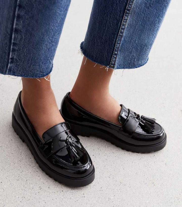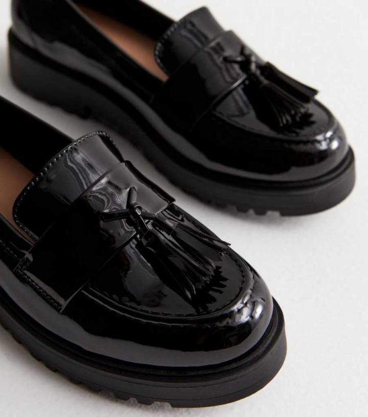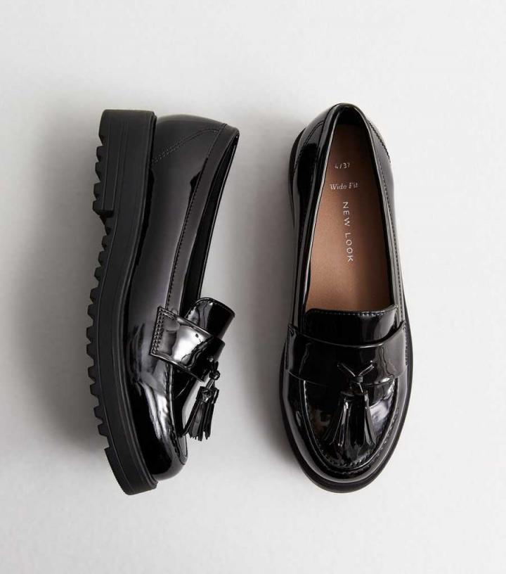 – Wide fit (D fitting)- Extra measure across the insole, joint and instep- Patent finish- Rounded toe- Tassel detail- Slip-on design- Cleated chunky sole