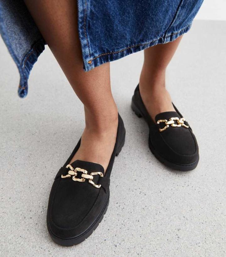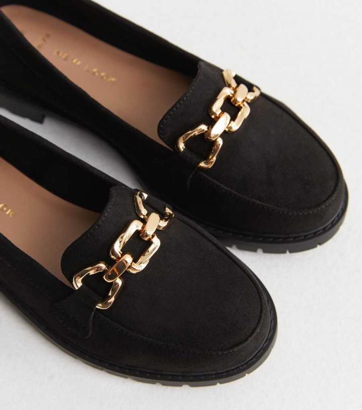 Wide Fit. Crafted from a luxe suedette and detailed with shiny gold chain, these black loafers serve a sophisticated addition to your shoedrobe.