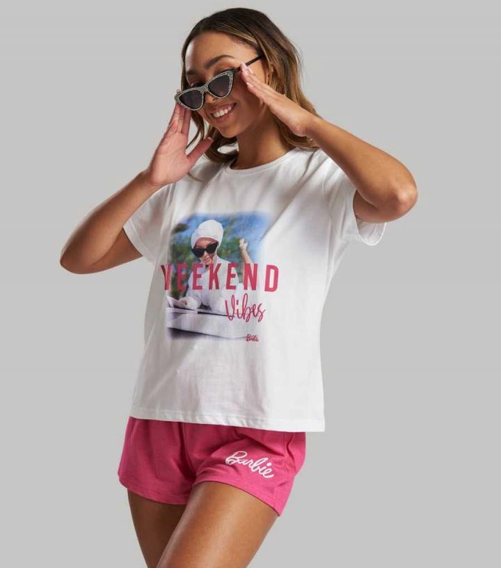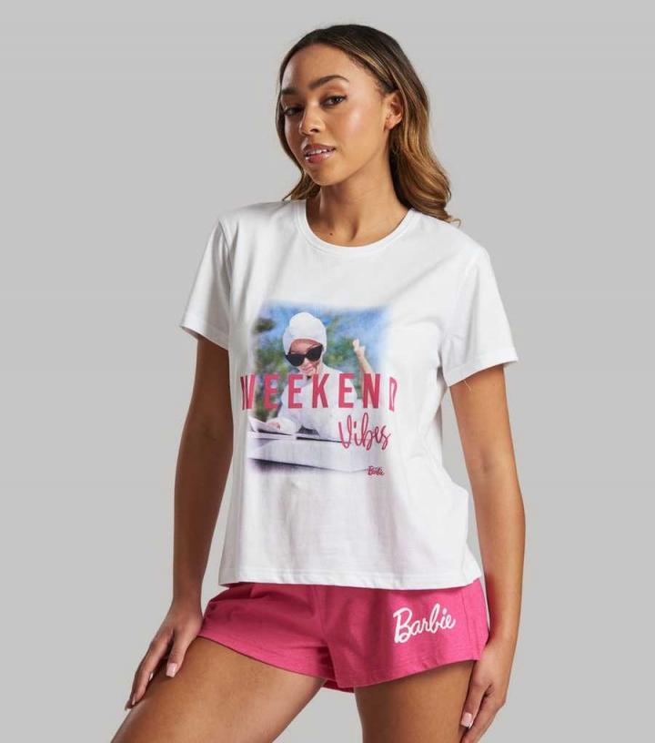 Loungeable. Go to sleep in style with these white Barbie pyjamas. They’re perfect treat for yourself or a loved one. Top:- Online exclusive- ‘Weekend Vibes’ Barbie logo- C…