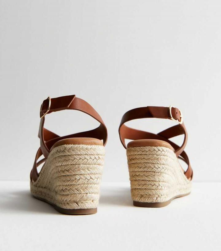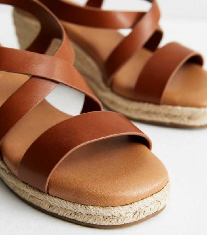 – Tan- Leather-look finish- Open toe- Slingback buckle strap- Flat sole- Espadrille wedge heel- Heel height: 2.9" / 7.5cm