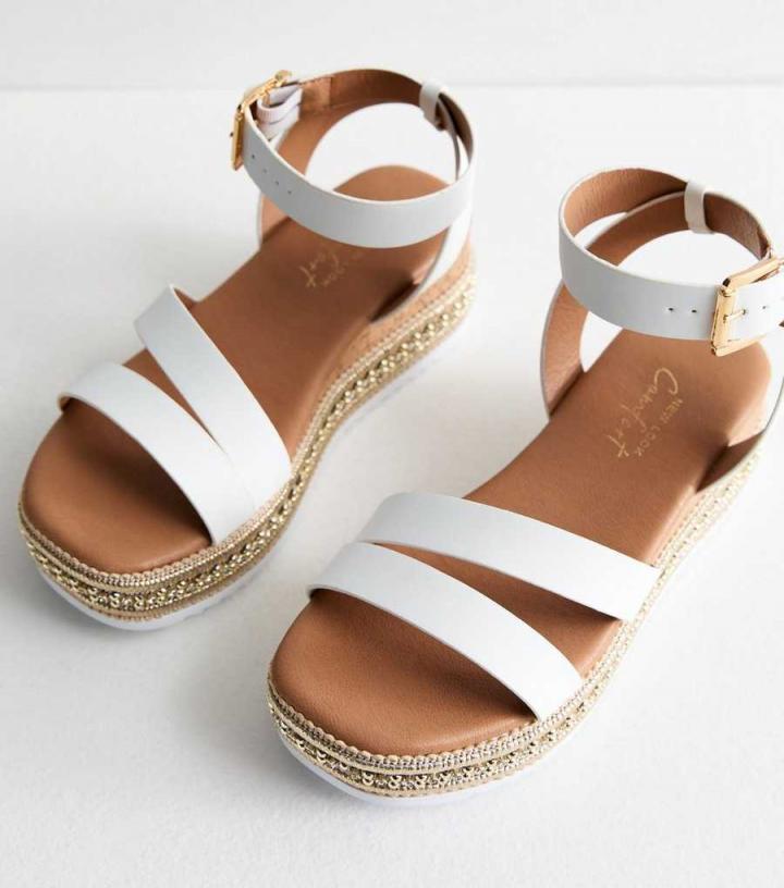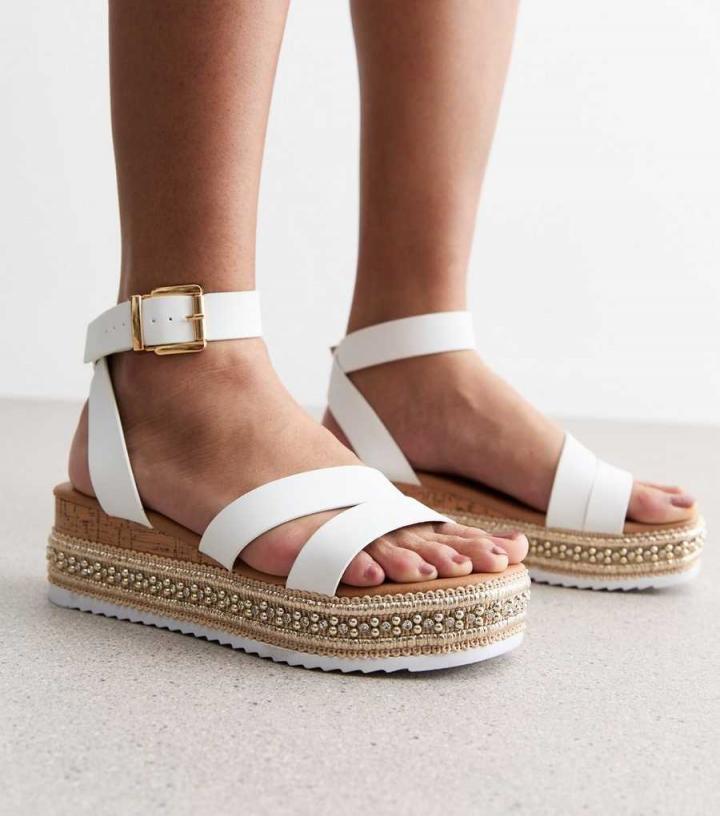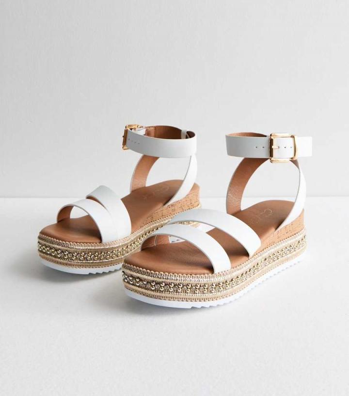 – White- Leather-look finish- 2-part design- Open toe- Gold-tone hardware- Metallic embellished trim- Ankle strap fastening- Flatform sole- Flatform height: 2.4" / 6cm