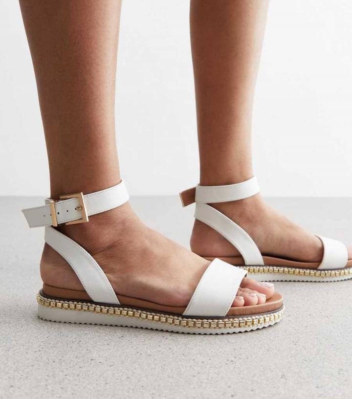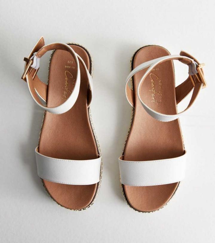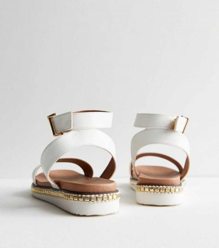 Sandals | New Look Womens Wide Fit White Leather-Look 2 Part Gold Trim Sandals