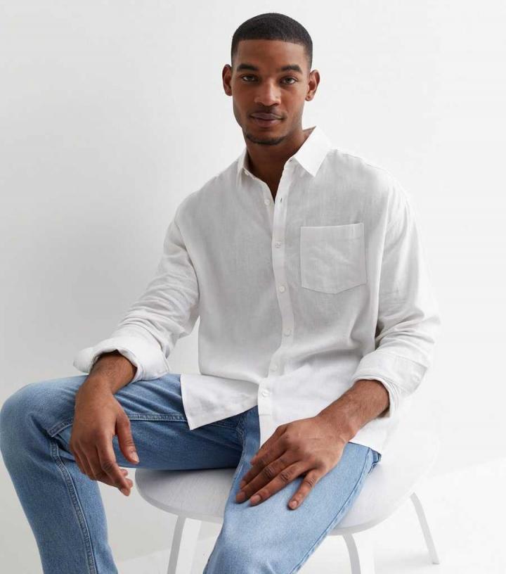 Mens White Linen Blend Long Sleeve Shirt New Look…
