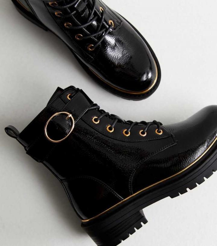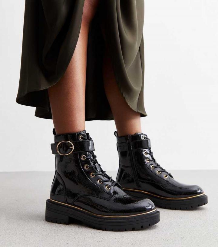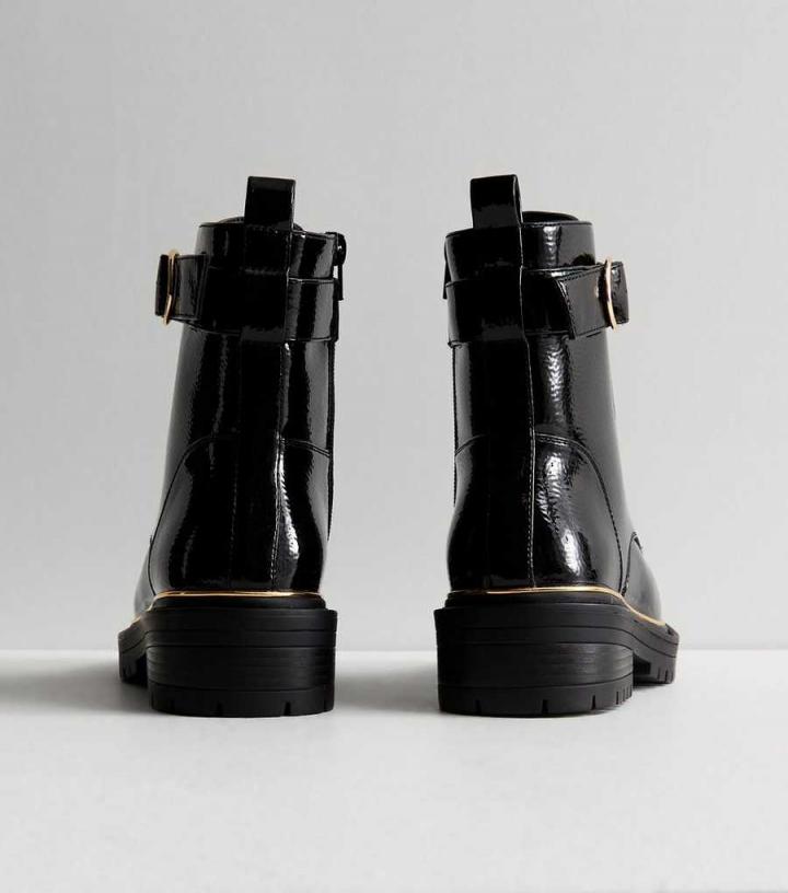 – Wide fit (D fitting)- Extra measure across the insole, joint and instep- Patent finish- Gold-tone hardware- Buckle detail- Pull-on tab- Side-zip fastening- Chunky sole- Block heel