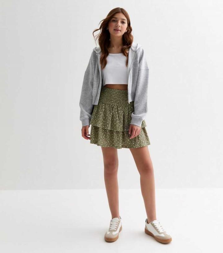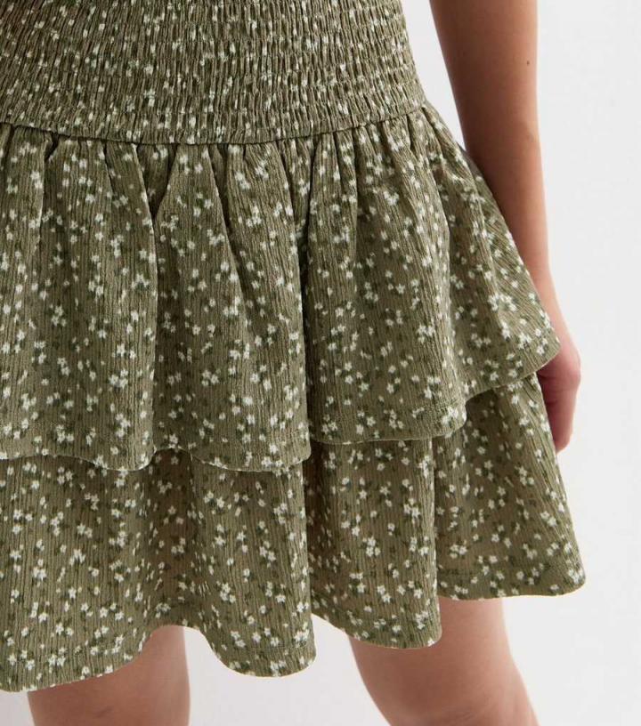 GirlsOlive Ditsy Floral Tiered Mini Skirt New Look