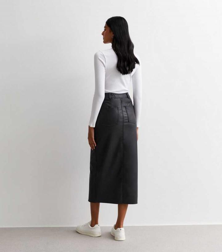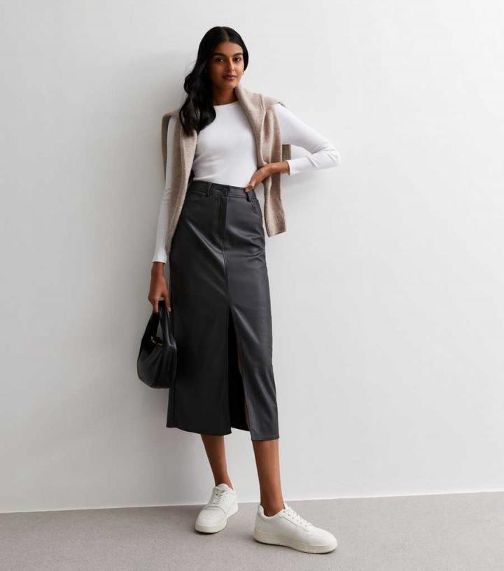 Boasting a split hem and leather-look finish, this black midi skirt is set to become a wardrobe staple. Easily styled with everything from jumpers to tees, it’s a versatile pick for this season and next.