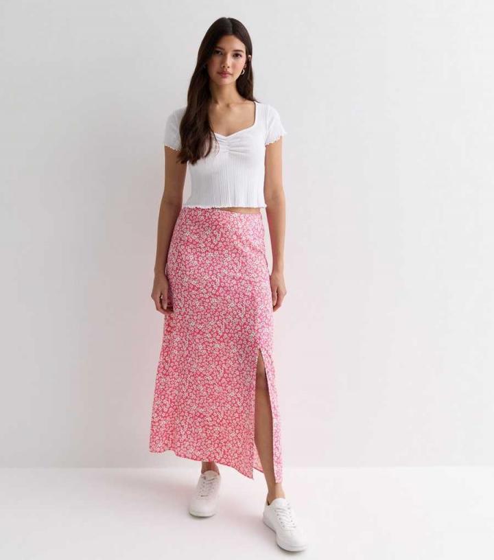 – Pink/white- Floral print- High waist- Split hem- Unlined- Midi length- Zip-side fastening- Lightweight fabric- Model is 5’8"/173cm and wears UK 10/EU 38/US 6