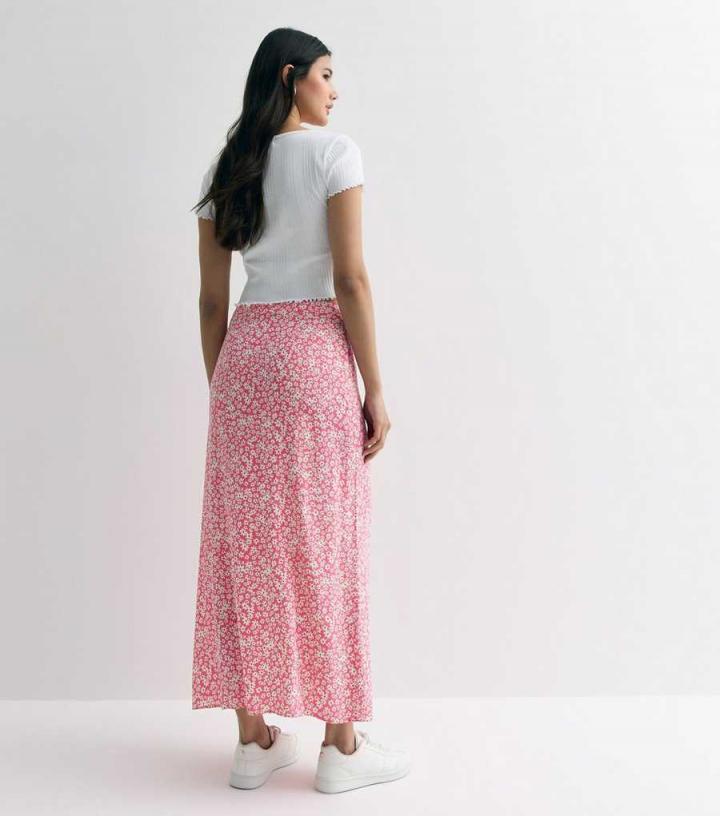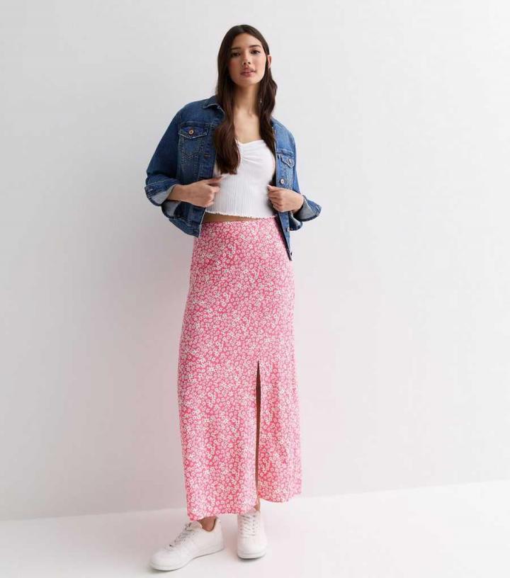 Add a mood-boosting touch to your new-season wardrobe with this pink midi skirt, decorated in a floral print with a statement split hem.