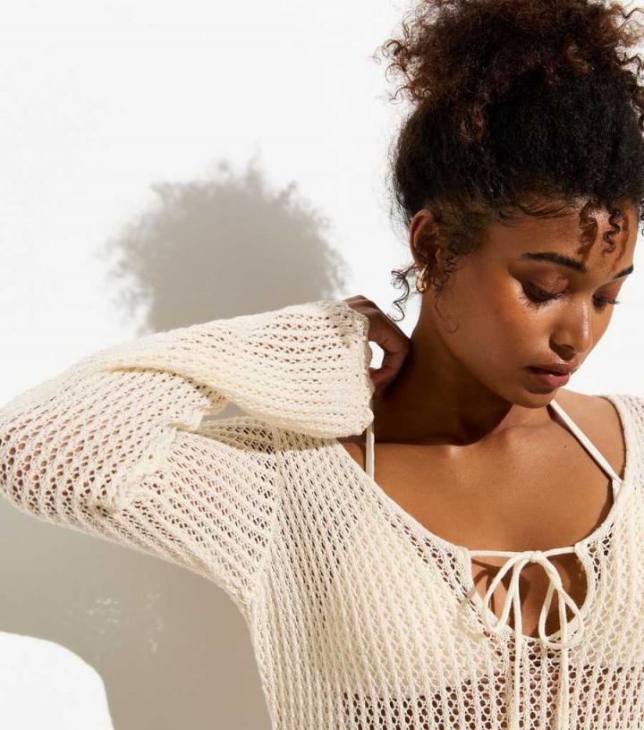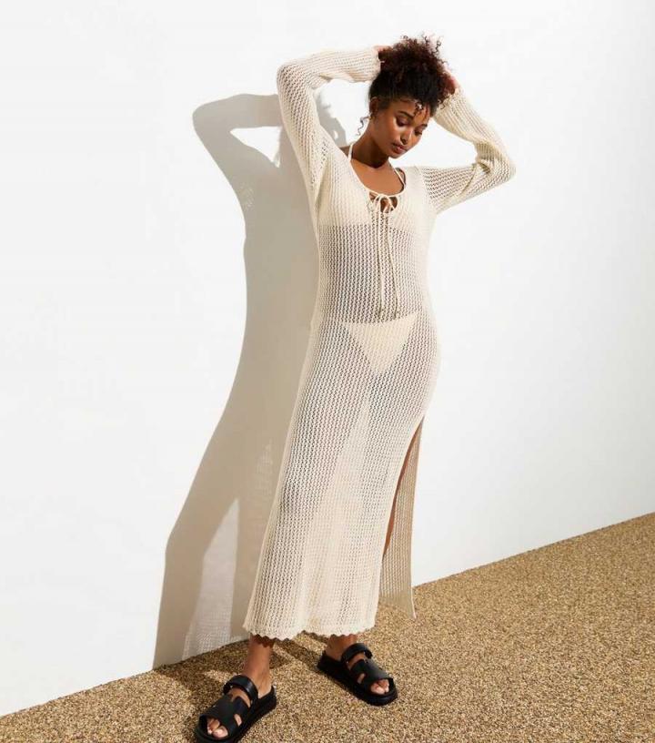 – Cream- Scoop tie-neckline- Long sleeves- Split hem- Maxi length- Crochet knit fabric- Slim fit- Model is 5’9.5"/176.5cm and wears UK 10/EU 38/US 6