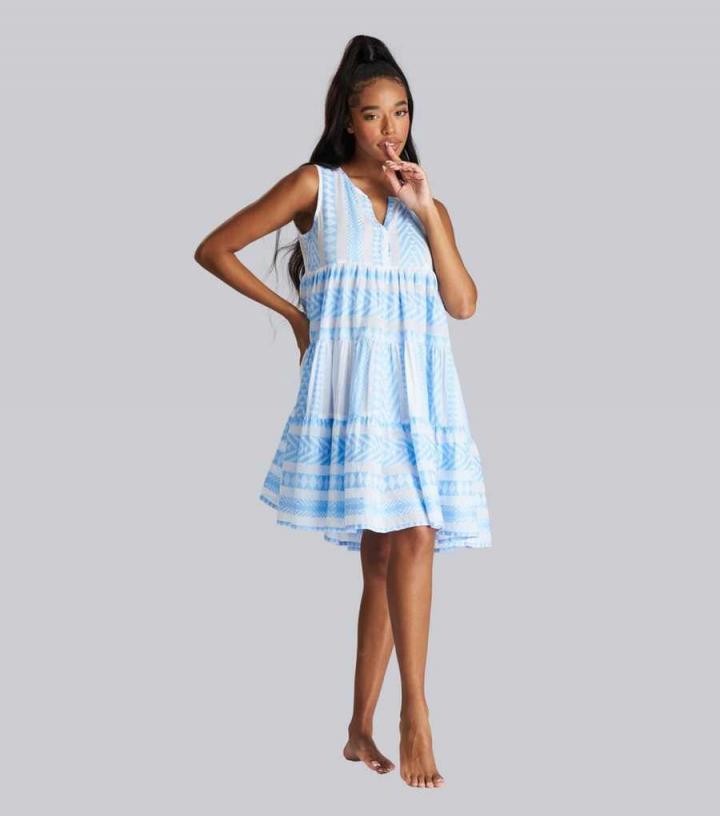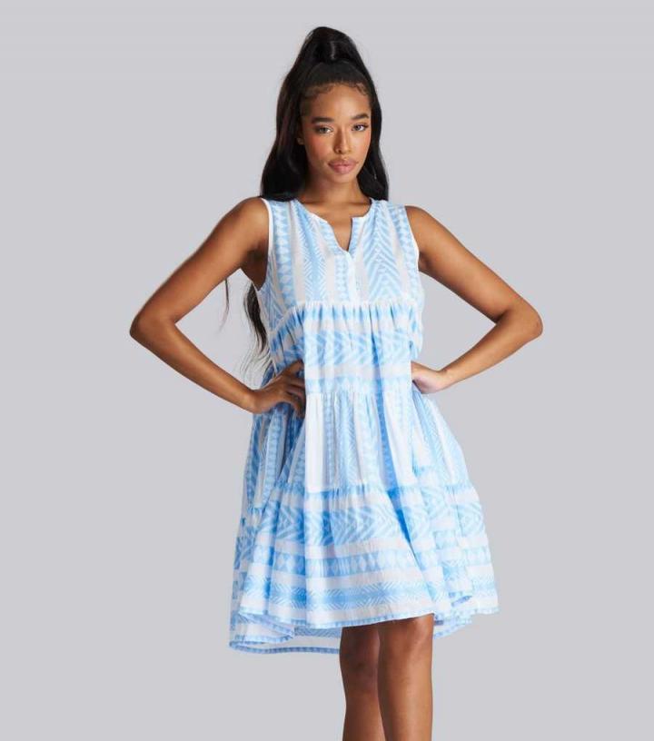 South Beach. Decorated in a geometric print, this blue mini dress is a shore thing on beach days. Throw it over your swimsuits and let it take you from sunbathing to sangrias in style.